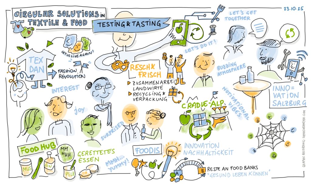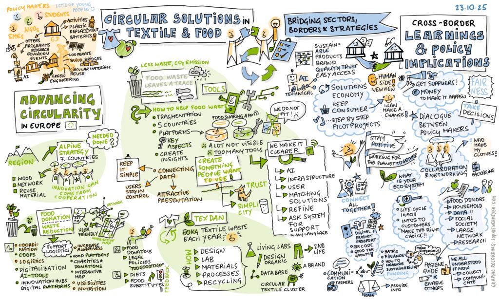 At the CEFoodCycle project’s final event in Salzburg (23.10.2025), professional illustrator Sophie Wehmeyer captured the essence of our panel discussions in real time Graphic Recording. Her vibrant graphic recordings transform complex topics like circular solutions in textiles and food into engaging visual stories bridging sectors, borders, and strategies at a glance.